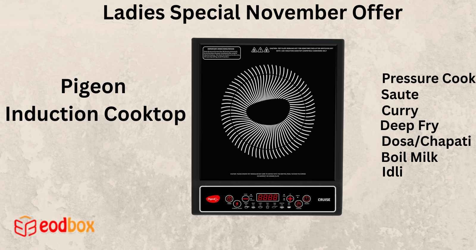 Included: 1 - Pigeon Cruise Induction Stove and User Manual;Power Input: 220 V and Power Consumption: 1800 Watt